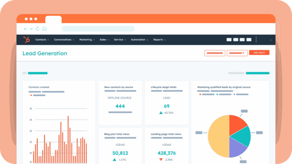 Track performance across contacts, emails, forms, and pipelines with customisable dashboards, giving your team instant visibility into what’s working, what’s stalled, and where to focus next.